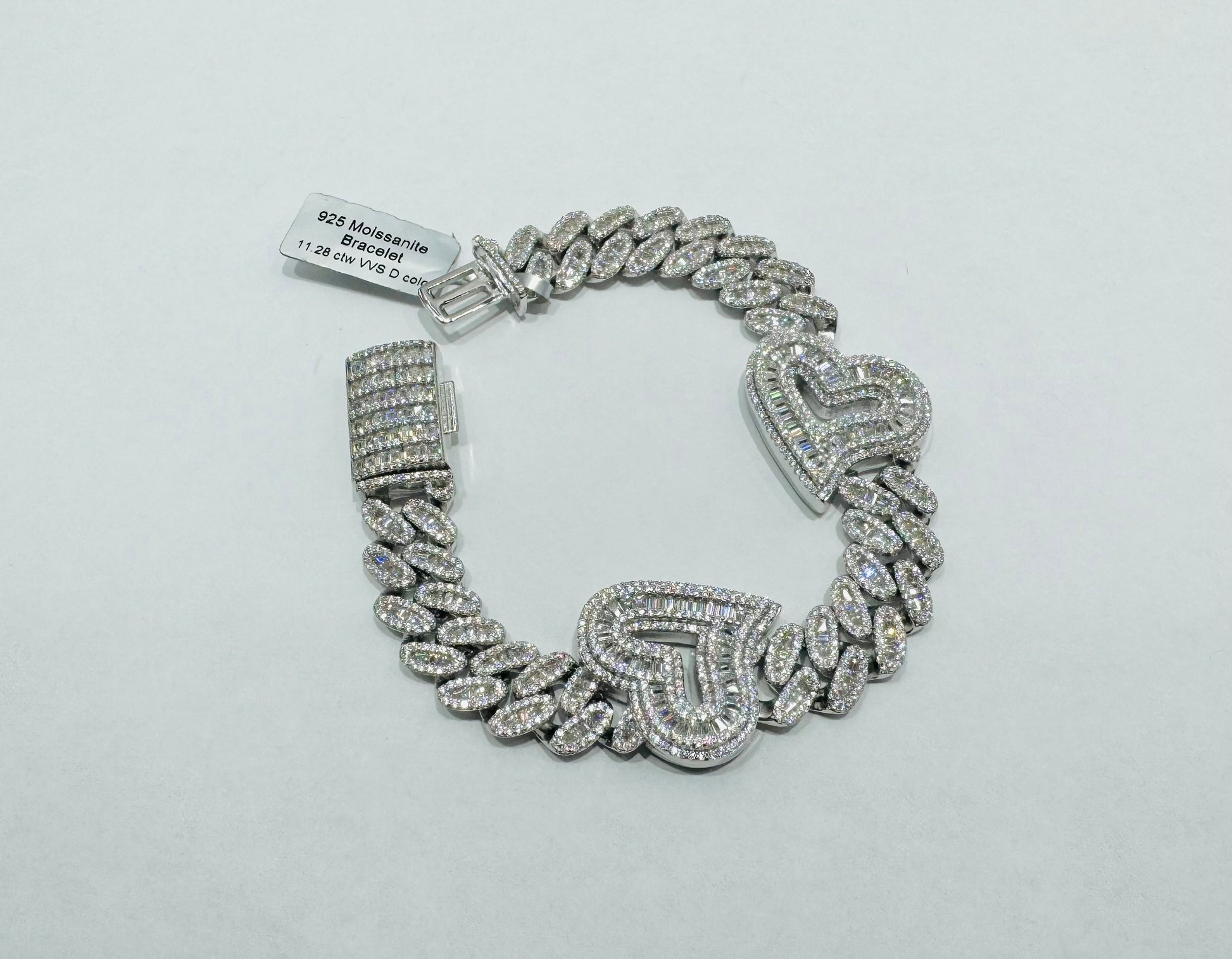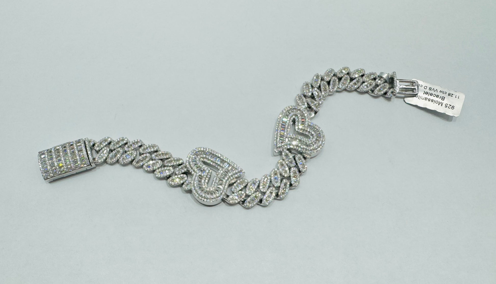 SILVER MOISSANITE CUBAN HEART BRACELET 7.5”, VVS- 11.28CTW